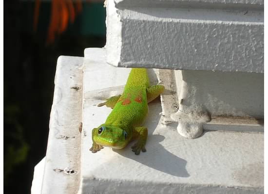 Now, I am not a reptile expert, but I believe that this is an orange-spotted day gecko. They like to eat papayas, bananas or anything sweet with nectar or sap. We saw these geckos fighting over something sweet on the edge of a lanai at a breakfast joint on the Big Island.